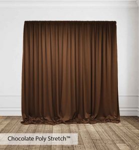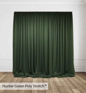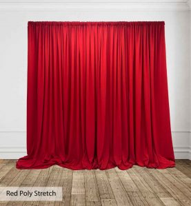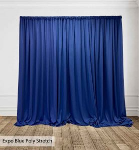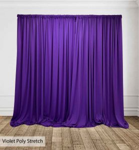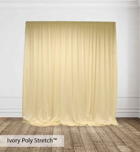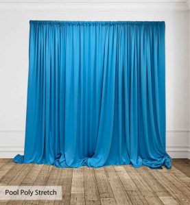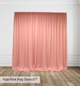 Poly Stretch™ Drape is typically sewn off a 60″ wide roll, and we recommend three panels per 10ft. Section of Pipe and Drape to obtain 50% fullness. (Ex. using three panels, 58″ wide you will have 13ft. of the drape on a 10ft section.)