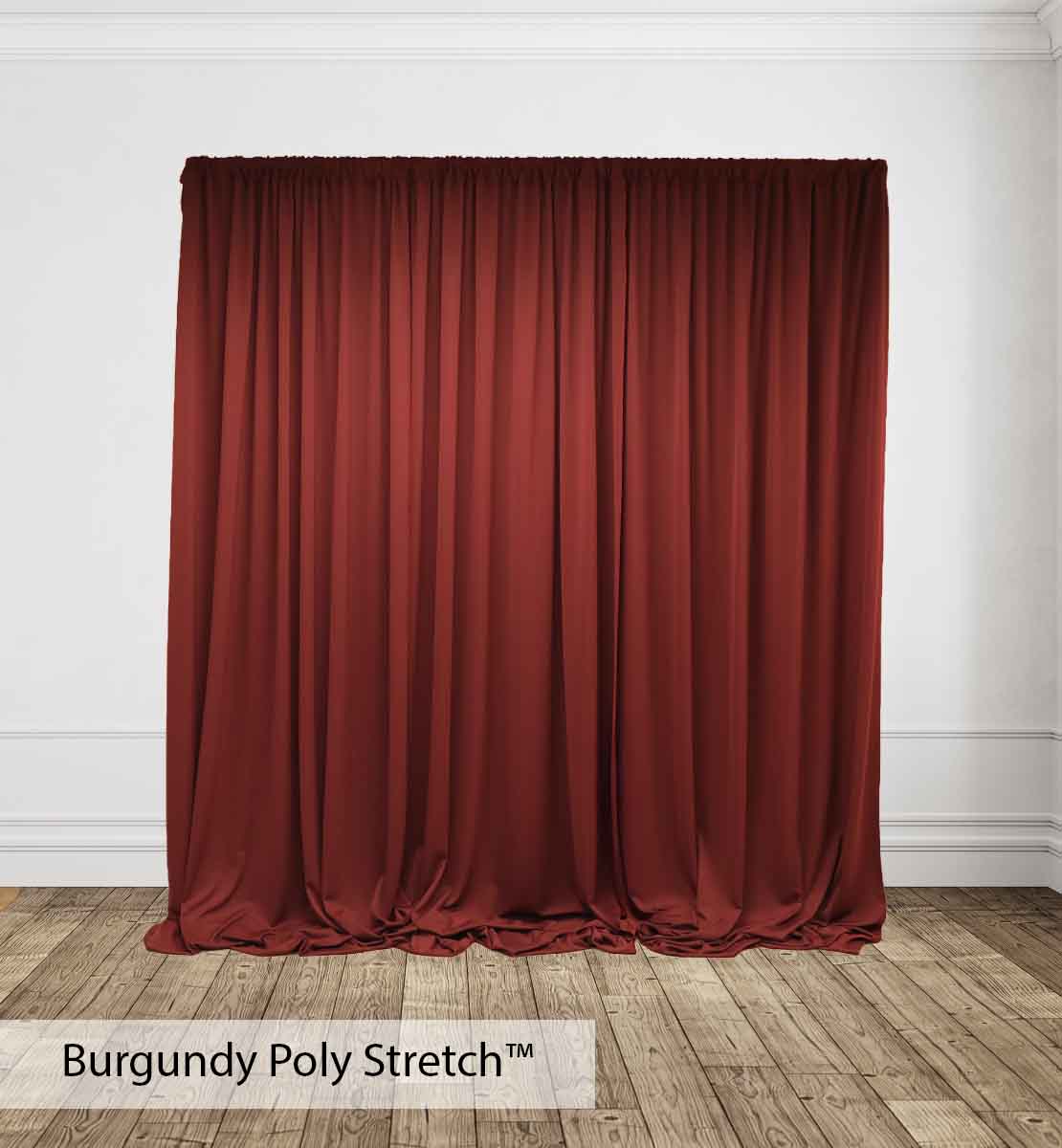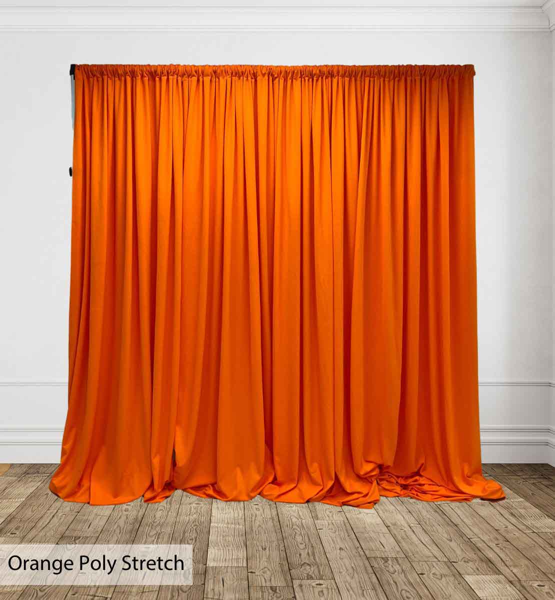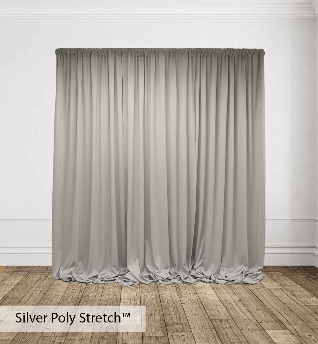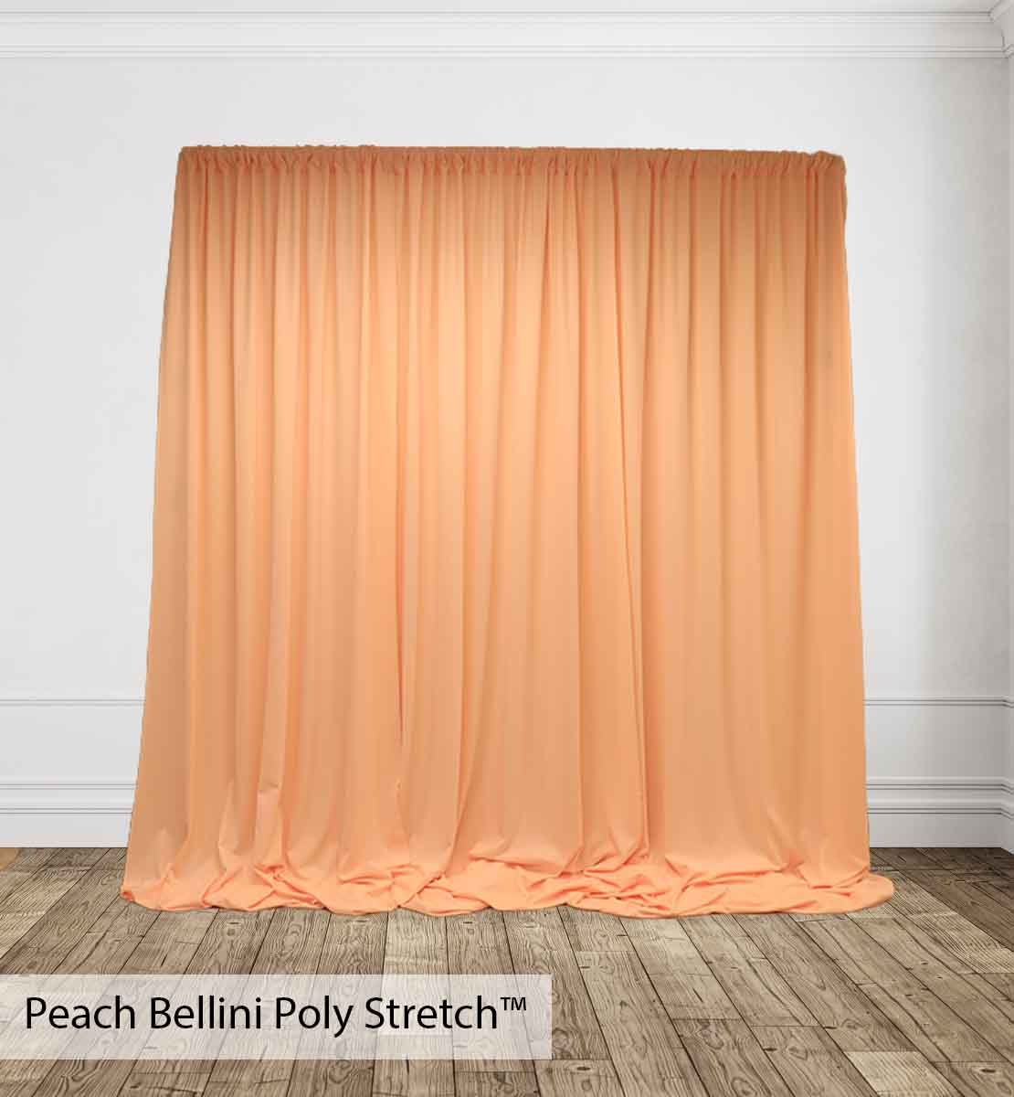 Poly Stretch™ Drape is typically sewn off a 60″ wide roll, and we recommend three panels per 10ft. Section of Pipe and Drape to obtain 50% fullness. (Ex. using three panels, 58″ wide you will have 13ft. of the drape on a 10ft section.)