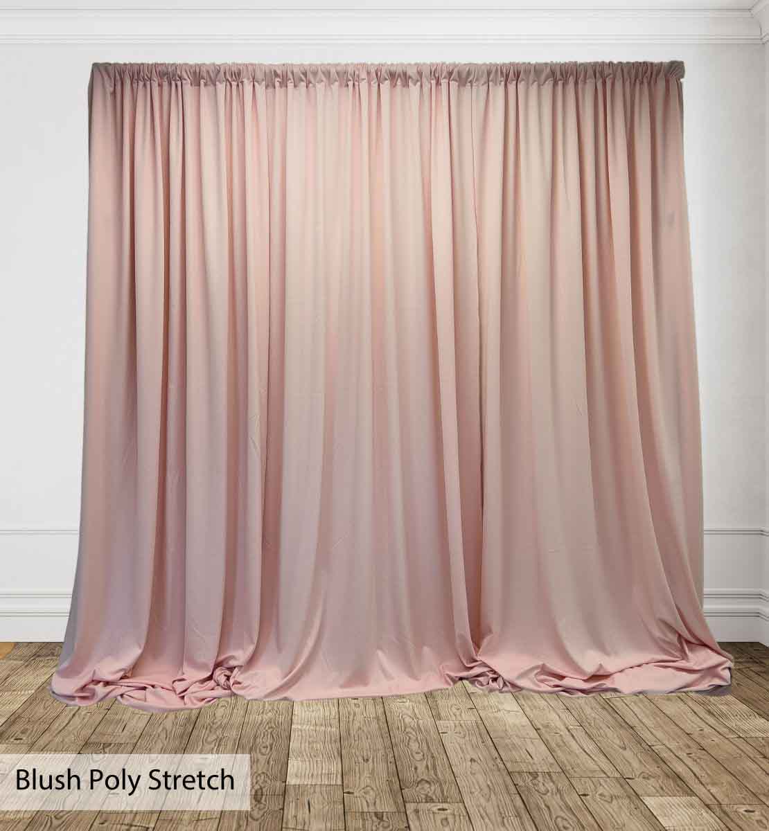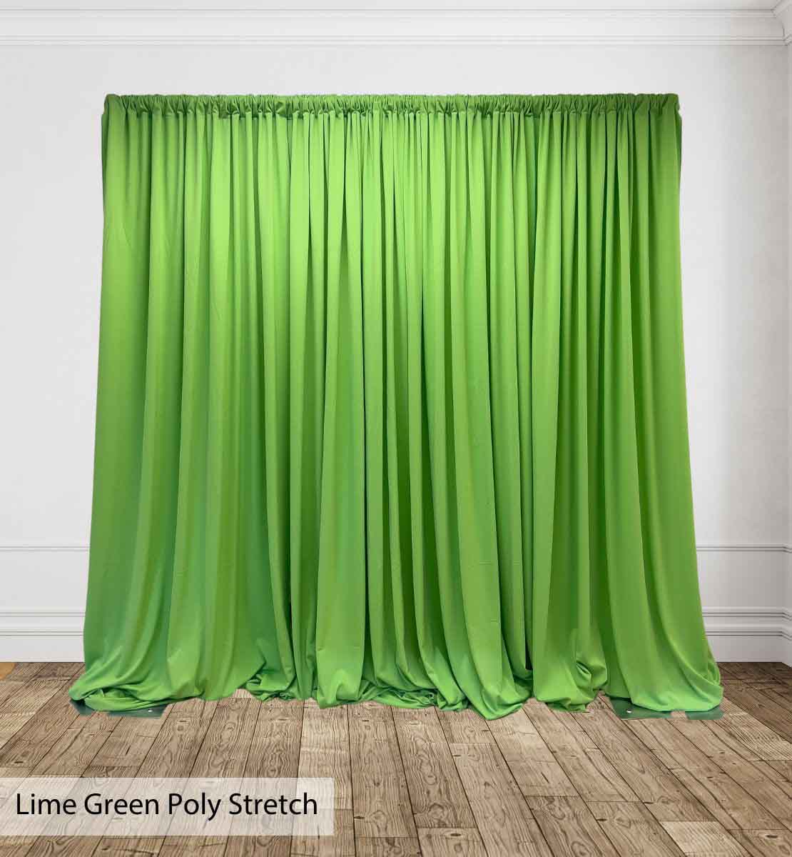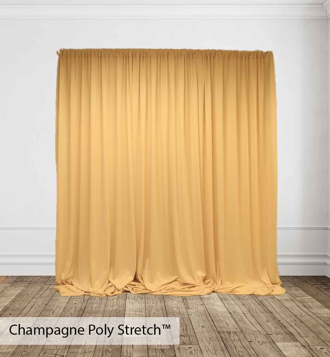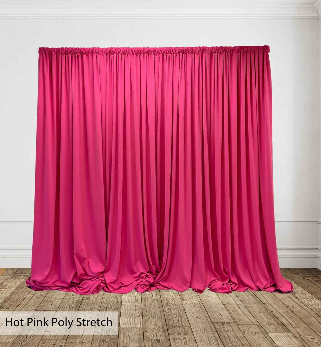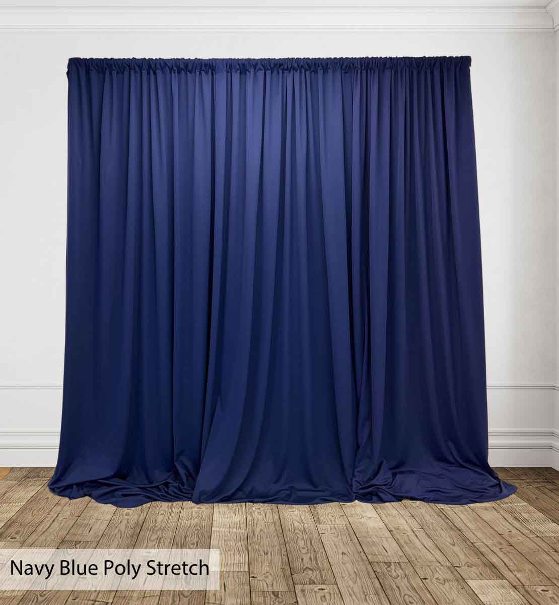 Poly Stretch™ Drape is typically sewn off a 60″ wide roll, and we recommend three panels per 10ft. Section of Pipe and Drape to obtain 50% fullness. (Ex. using three panels, 58″ wide you will have 13ft. of the drape on a 10ft section.)