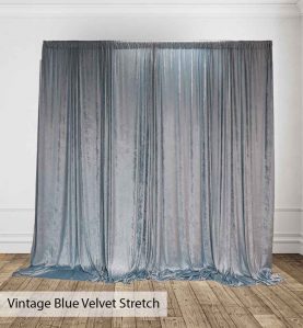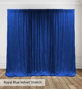 Velvet Stretch™ Drape is 58″ wide, and we recommend three to four panels per 10ft. section of Pipe and Drape to obtain 50% fullness. (Ex. Using four panels, 58″ wide, you will have 19ft. of Velvet Stretch™ drape on a 10ft section.) We also sell this fabric by the yard or roll (62″ W); for information rolled goods, click here.